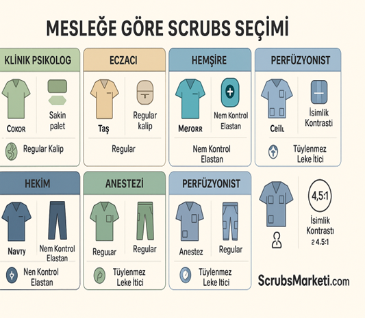 Mesleğe Göre Scrubs Seçimi: Klinik Psikologdan Perfüzyoniste Klinikte görev tanımı değiştikçe scrubs’tan beklenti de değişir. Mesleğe göre scrubs seçimi, doğru kesim, kumaş ve cep düzeniyle hem pr...