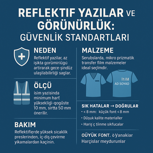 Cırtlı logolar nakış, dokuma etiket, PU/PVC, reflektif veya kombine malzemelerden üretilebilir. Steril alan dışı kullanıcılar için reflektif eklenti gece görünürlüğü sağlar; triyaj ve saha ekiplerinde avantaj yaratır. Klinik içi personelde ise dokuma/tekstil tabanlı logolar sessiz ve hafif oldukları için tercih edilir. Yüksek görünürlük gerektiren alanlarda EN ISO 20471 gibi standartlarla uyumlu reflektif yazı panelleri düşünülmelidir.