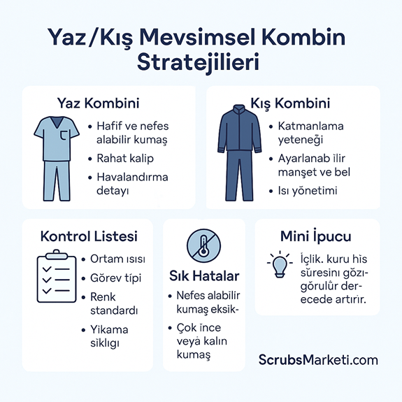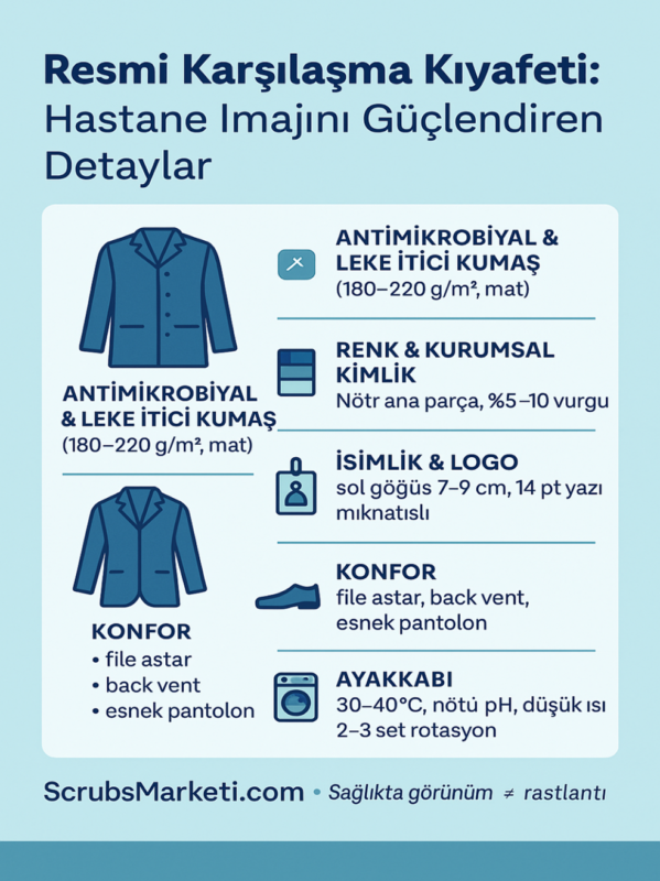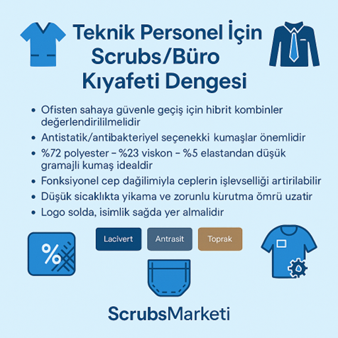 Saha seçenekleri, hızlı eğilip-kalkma, araç içi hareketler söz konusuysa lastikli pantolon tercihi hata payını azaltır. Poliklinik içinde hasta karşılayan, idari görüşmelere katılan personel için kemerli pantolon daha derli toplu durur. Mini ipucu: 4 yönlü esneme (≥%8 elastan) ve 160–220 g/m² gramaj, hem lastikli hem kemerli modellerde gün boyu formülden yardım alınır.