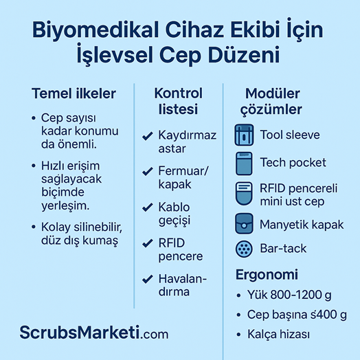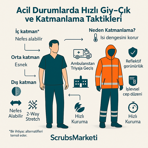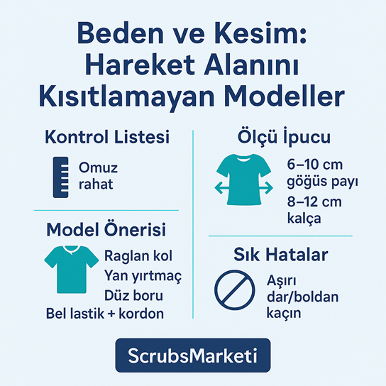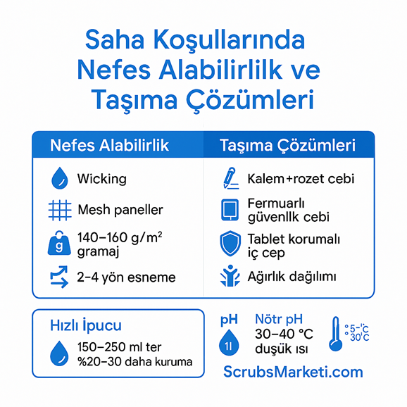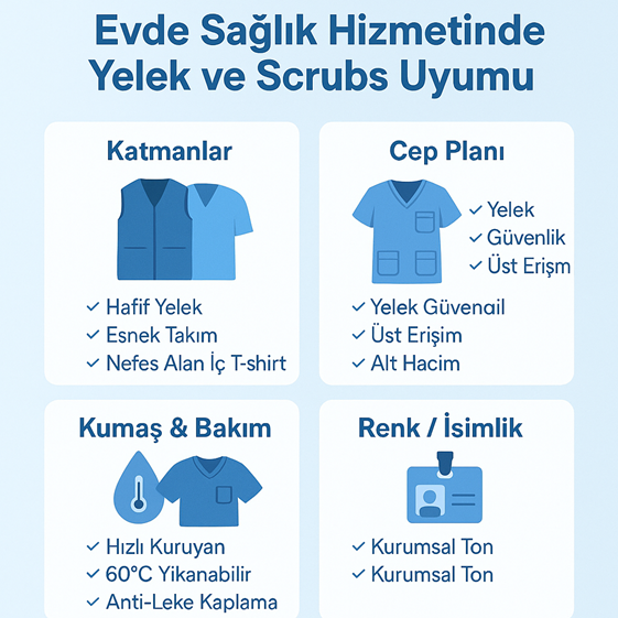 Stetoskop, tablet, kalem ve makas taşımak için lastikli pantolonlarda yan/arka cep derinliği kritik; Kemerli tiplerde ise kemer köprüsü ve ek aparat (anahtarlık, kart askısı) alanı avantajı sağlar. V-yaka üstlerde göğüs cebi erişimi hızlıdır; hakim yakada yaka hattı rozeti ve yansıtıcı baskı için temiz bir platform sunar.