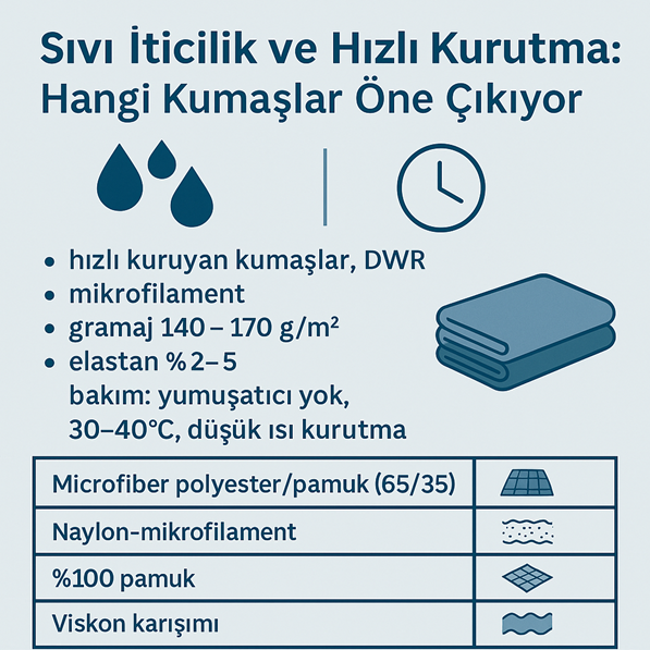Ter ve biyolojik sıvılar kumaşa tutunur; bu nedenle ön arıtma ve doğru program şartı. Nötr pH’lı deterjan, 30–40 °C aralığında, düşük devirler önerilir. Ağartıcı/klor yalnızca üretici izin verensa ve lokal lekede kullanıma uygundur. “Renk sabitleme” için ilk yıkamada benzer tonlarla yıkama; mikrofiber ve antistatik karışımlarda yumuşatıcıdan kaçınmak (lif kaplamasını güçlendirir). Kontrol listesi: Etiket talimatı, renk düzeni, ceplerin boşaltılması, fermuar/bağların kapatılması, içe çevirme.
