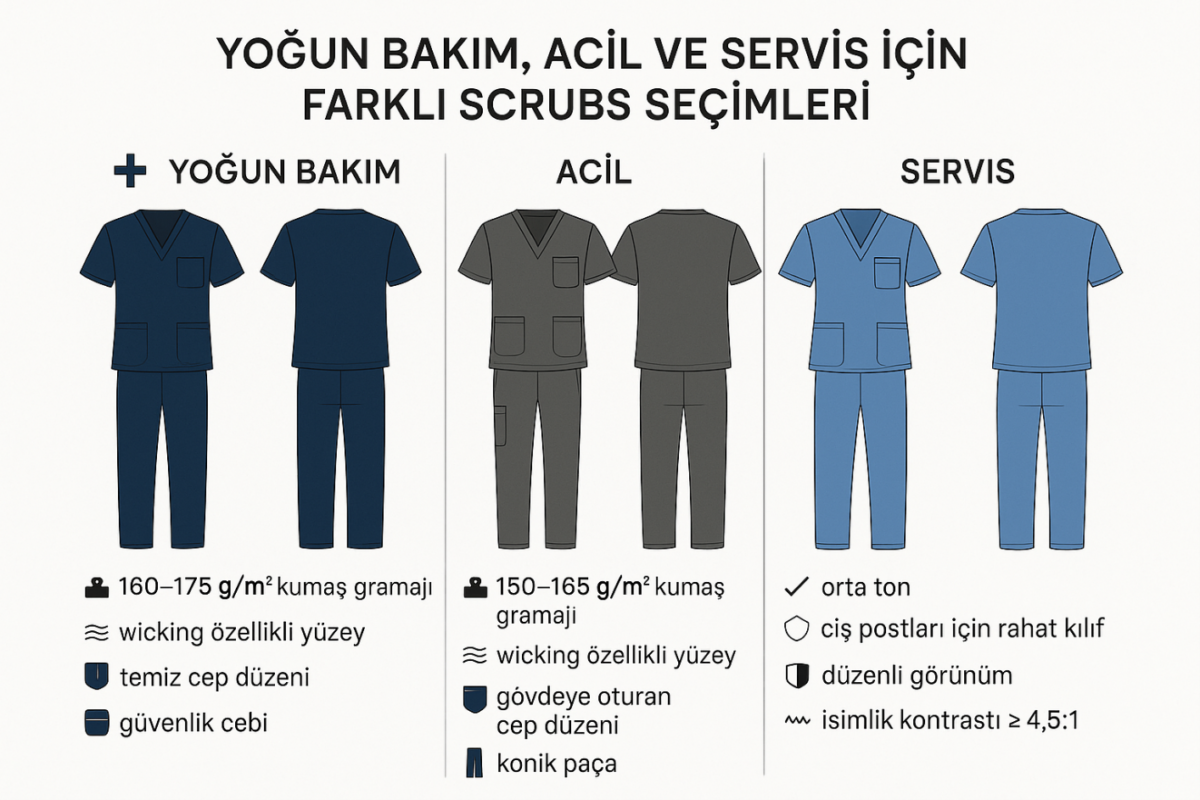 Kritik alanlarda görünürlük, hareket serbestliği ve hijyen yönetimi, yoğun bakım, acil ve servis için scrubs seçimleri yapılırken farkl...